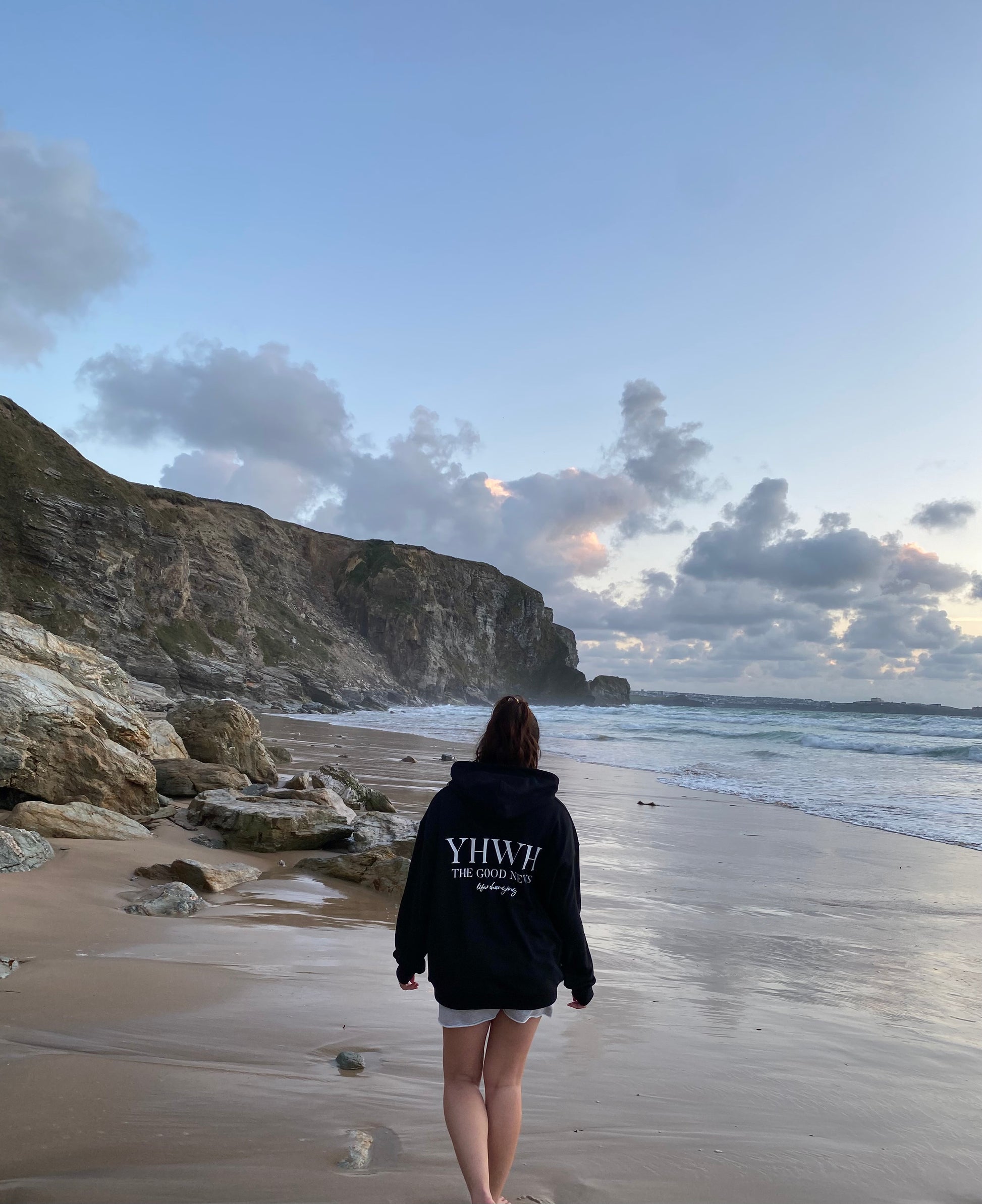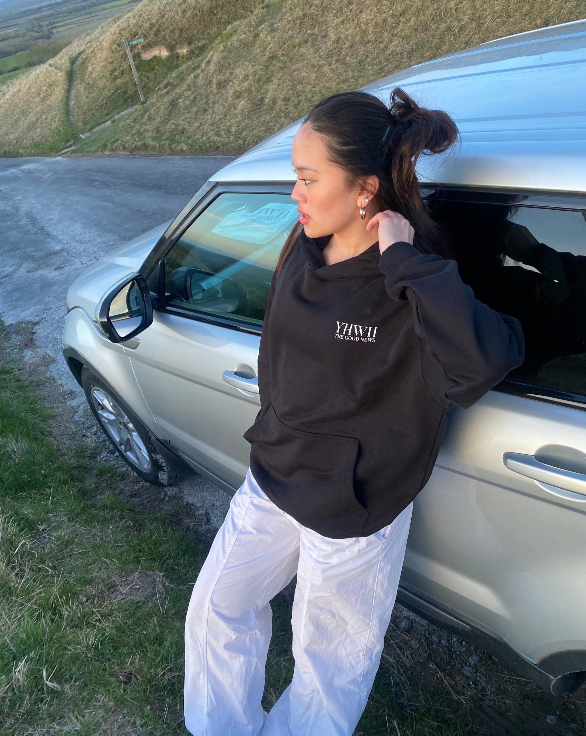 This is the YHWH Hoodie in Black. It's made from 100% French Terry cotton. It's heavyweight sitting at 380gsm with dropped shoulders and oversized fit cutting. It features screen printed design on the front and back. Female model is 5'4 wearing size M.